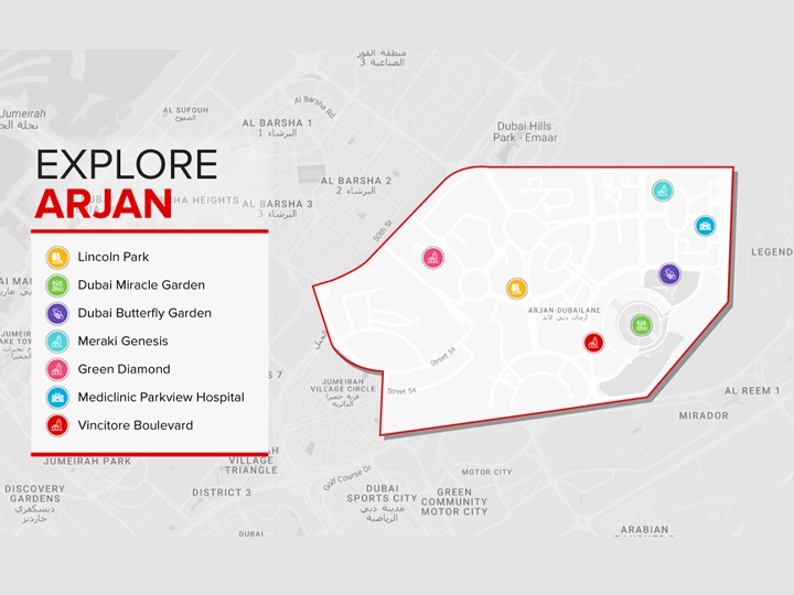 Arjan is strategically located near the junction of Umm Suqeim Road (D63) and Mohammed Bin Zayed Road (E311), offering quick access to:
