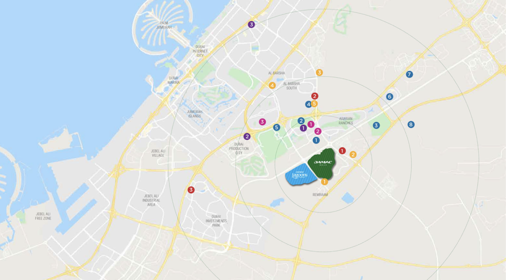 DAMAC Lagoons is located adjacent to DAMAC Hills and Tilal Al Ghaf, with direct access to: